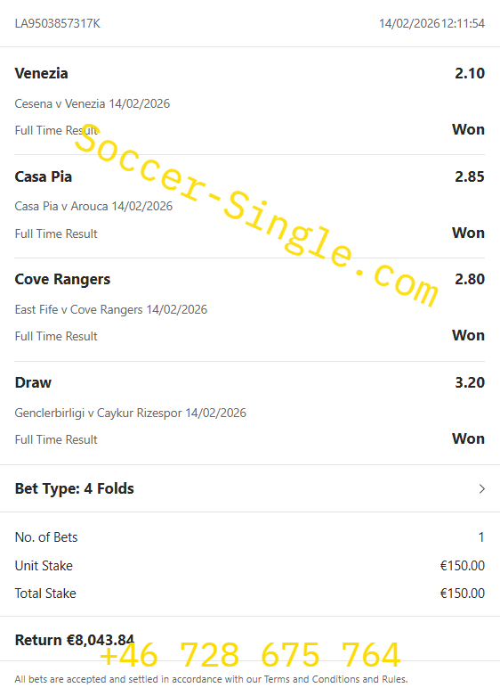 LAST 4 COMBINED VIP TICKET FIXED MATCHES ON: 14.02.2026 | WIN